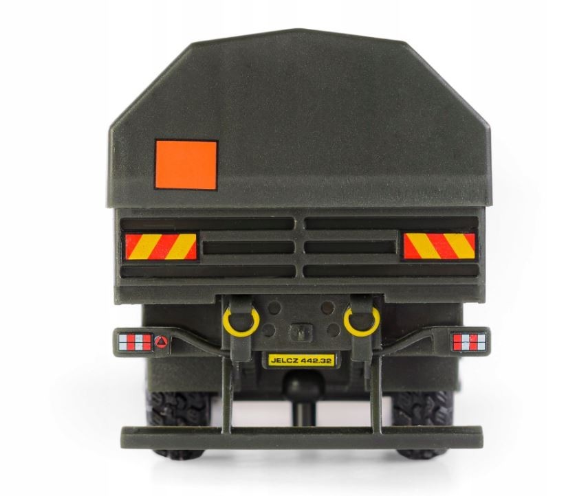 Modelis vaizduoja JELCZ tipo 442.32 krovininį automobilį, sukurtą Lenkijos įmonės Jelcz Sp. z o.o. Jelcz-Laskowice mieste. Tai specialus transporto priemonės modelis, pritaikytas kariuomenės poreikiams. Jis susideda iš dviejų vietų, hidrauliniu būdu pasvirančios kabinos ir dėžės kėbulo. Kėbulas skirtas vežti krovinius po atviru dangumi ir ant paletų, taip pat tinkamas vežti ISO 15 pėdų konteinerį. Kolekcinis modelis atspindi autentišką transporto priemonę. Pagamintas iš metalinių ir plastikinių dalių, jis turi savybių, būdingų šiai transporto priemonei: kabinos priekyje yra Jelcz įmonės logotipas, žibintai, būdingi geltoni keltuvai, ADR plokštelė, geltona modelio identifikavimo plokštelė, specialios transporto priemonės ženklas, papildomi priekiniai ir šoniniai veidrodžiai. Ant stogo yra stogo anga, oranžinė mirksinčio žibinto lampada ir paieškos žibintas, skirtas apšviesti aplinką. Kabinos vidus atspindi autentiškos transporto priemonės įrangą. - Kolekcinis modelis Jelcz 442.32 yra licencinis modelis - Jelcz licencija - DIE CAST METALO modelis su plastikais, mastelis 1:50 - Produktas atitinka Europos žaislų saugos standartą - Amžiaus reikalavimas: 14+