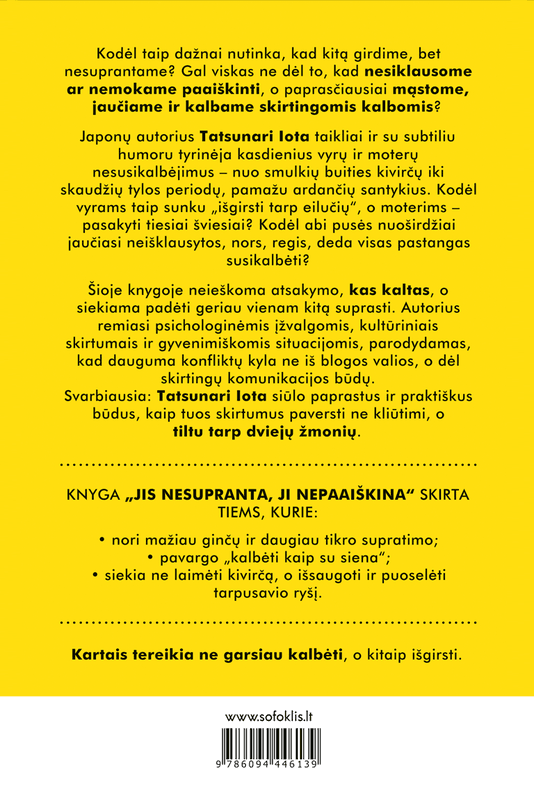 Japonų autorius Tatsunari Iota taikliai ir su subtiliu humoru tyrinėja kasdienius vyrų ir moterų nesusikalbėjimus – nuo smulkių buities kivirčų iki skaudžių tylos periodų, pamažu ardančių santykius. Kodėl vyrams taip sunku „išgirsti tarp eilučių“, o moterims – pasakyti tiesiai šviesiai? Kodėl abi pusės nuoširdžiai jaučiasi neišklausytos, nors, regis, deda visas pastangas susikalbėti?
