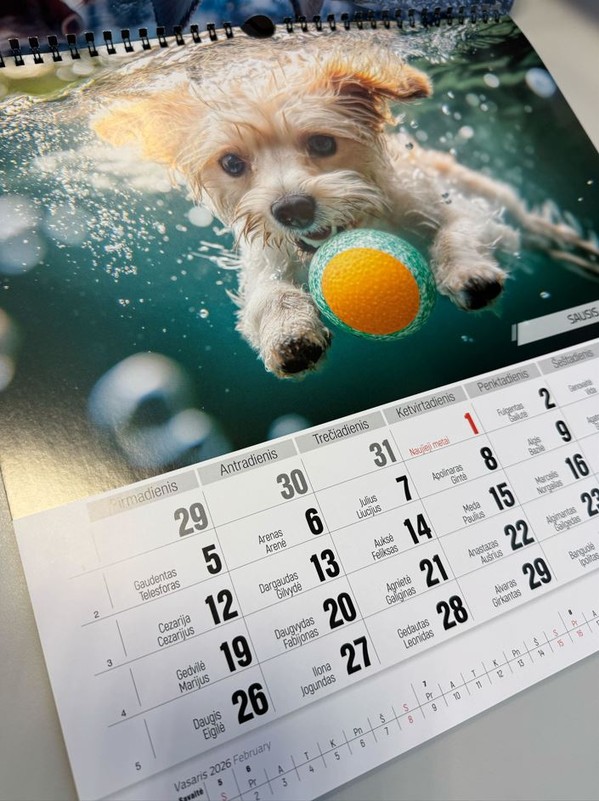 Sieninis 2026 m. kalendorius su spirale „Povandeniniai šunų nuotykiai“. Dydis: 33 x 33 cm.