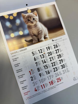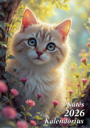 Sieninis 2026 m. kalendorius su kačių nuotraukomis.