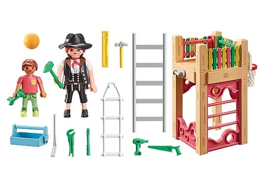Žaidimų aikštelėje statomas naujas bokštas. Stalius kruopščiai dirba, įgudusiai sudėdamas visus elementus. Mažasis berniukas su nekantrumu laukia, kada pagaliau galės įšventinti žaidimų bokštą. PLAYMOBIL Pradžios rinkiniai kviečia vaikus tiesiogiai pasinerti į įvairią PLAYMOBIL pasaulio pasaulį. Rinkiniai apima žaidimo figūrėles ir atitinkamus priedus iš populiarių PLAYMOBIL pasaulių, greitai surenkami ir jau iškart paruošti žaidimui. Gerai aplinkai: žaidimų rinkinys sudarytas iš daugiau nei 80% tvarių medžiagų.