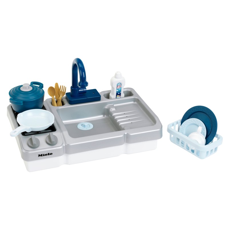 KLEIN kriauklė MIELE turi veikiantį čiaupą ir įvairių priedų. Žaisk su tikru vandeniu ir išplauk indus po kiekvieno valgio! Rinkinyje yra žaislinės lėkštės, keptuvė ir kiti virtuvės reikmenys.