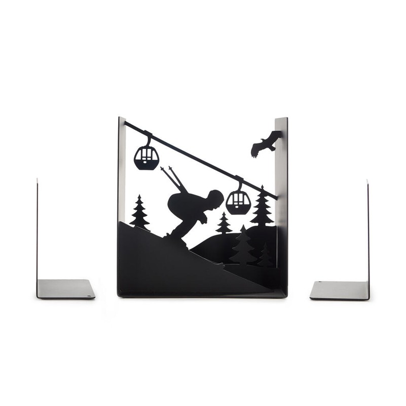 ORIGINALUS DIZAINAS. Knygų atrama su kalnų peizažu: slidininku, pušimis, lyniniais keltuvais ir ereliu.