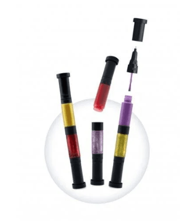 Dėžutėje yra trys dvigubo buteliuko rašikliai: raudono, auksinio ir violetinio, taip pat standartinė ir blizgučių versija. Kiekvienas buteliukas turi teptuko ir rašiklio galiukus.