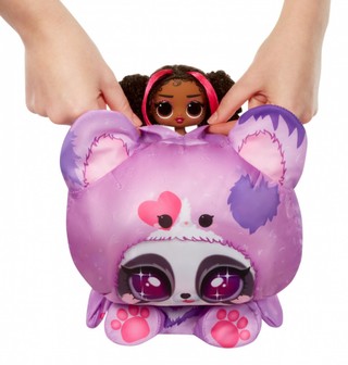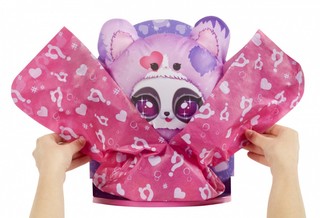 Pirmiausia, praskirpkite užtrauktuką paketo apačioje ir pakelkite išorinį rožinį apvalkalą, kad atskleistumėte paslaptingą pakavimo popierių! Stebėkite, kaip popierius tampa didesnis ir pilnesnis, ir kai jis visiškai išsipučia, suplėšykite popierių ir atskleiskite savo mielą kostiumą! Bet palaukite, siurprizai čia nesibaigia! Atsegkite Velcro, kad atskleistumėte nuostabų Hoops Cutie Tweens lėlę, paslėptą viduje!
