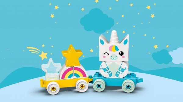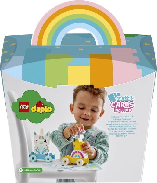 Nudžiuginkite mažylį su žaviu ir spalvingu LEGO® DUPLO® Mano pirmuoju vienaragiu (10953). Šis universalus žaislas konstruojamas iš spalvingų figūrėlių, kurias patogu suimti, prijungti ir traukti smulkiomis rankutėmis. Lavinamasis vienaragio žaislas Įtraukite mažylius į išradingą žaidimą, kuris lavina konstravimo įgūdžius ir supažindina su formomis ir spalvomis. Vienaragio traukinys su vaikams pritaikytomis dalimis, kurios prisijungia ir atsiskiria nuo traukiamų vagonų, yra kupinas žaidimo galimybių. Rinkinį sudaro konstravimo kortelės su realaus dydžio modelių vaizdais, kad konstruodami vaikai galėtų statyti kaladėles, o tėvai galės juos supažindinti su spalvomis ir formomis. Kad būtų smagiau, traukinys prisijungia prie kitų ratuotų DUPLO žaislų. Betarpiški žaislai mažyliams LEGO DUPLO žaislai suteikia vaikams nevaržomą, saviraišką skatinantį ir smagų lavinimąsi. Su DUPLO rinkiniais tėvai ir vaikai gali drauge siekti naujų raidos aukštumų smagiai žaisdami.