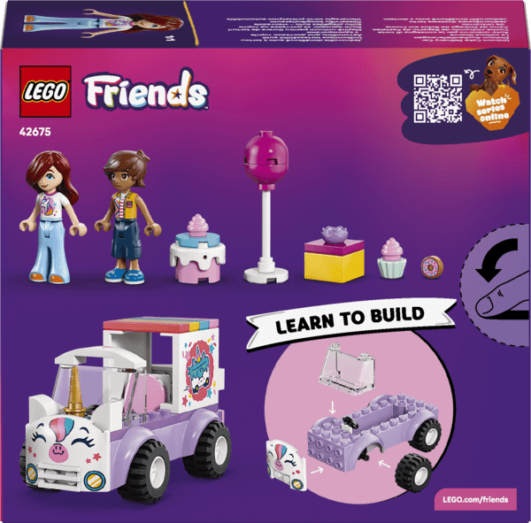BIRTHDAY TOYS – LEGO® Friends Unicorn Cake Delivery Car (42675) opens up a world of preschool learning activities such as storytelling with the birthday gift, cake toy, balloon and donut accessories