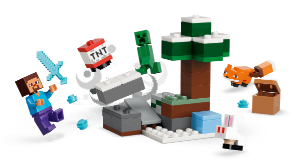 4 LEGO® MINECRAFT® CHARACTERS – Build adventures set in the taiga biome with a Steve minifigure, plus a Creeper™ and 2 Minecraft animal figures, a fox and a baby bunny