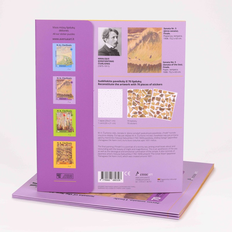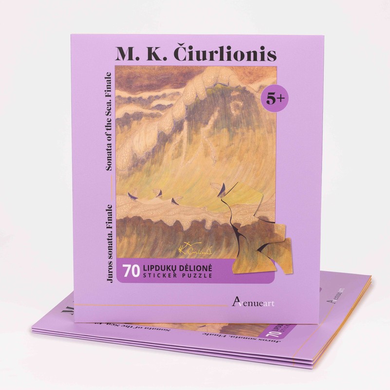 M. K. Čiurlionio paveikslo „Sonata Nr. 5 (Jūros sonata. Finale)“ dėlionė. Dėlionė skirta vaikams nuo 5 metų amžiaus arba jaunesniems, jei jau pažįsta raides ir skaičius. Rinkinyje yra trafaretas su laukeliais, pažymėtais skaičiais bei raidėmis ir du lapai lipdukų. Kiekvienas lipdukas turi savo skaičių arba raidę. Juos suklijavus į atitinkamas vietas prieš akis pamažu atsiveria M. K. Čiurlionio paveikslas. Žaidimas sukurtas siekiant supažindinti vaikus su garsaus Lietuvių dailininko meno kūri…