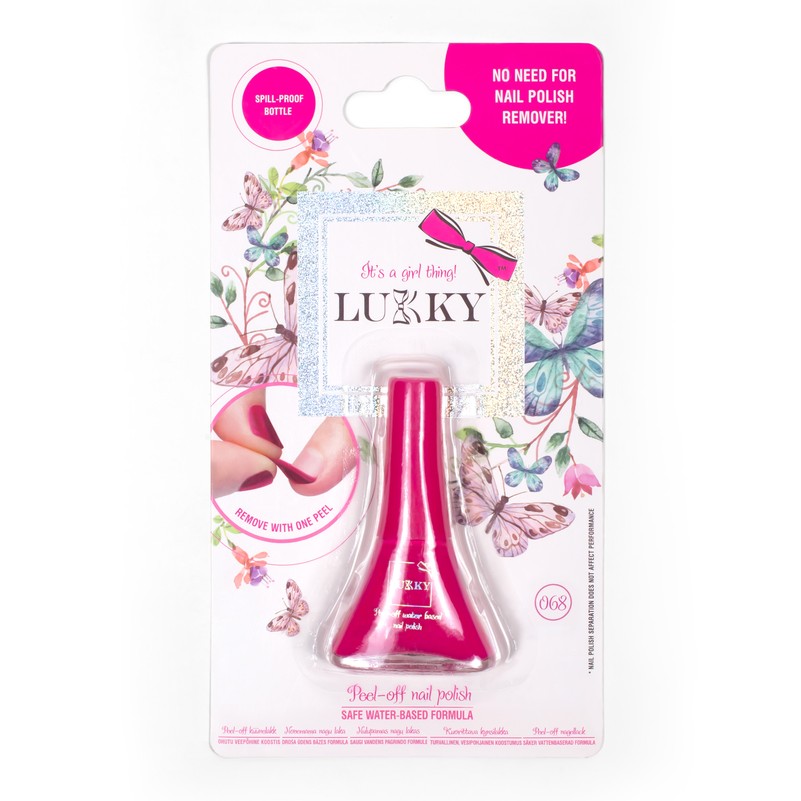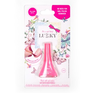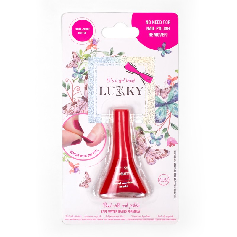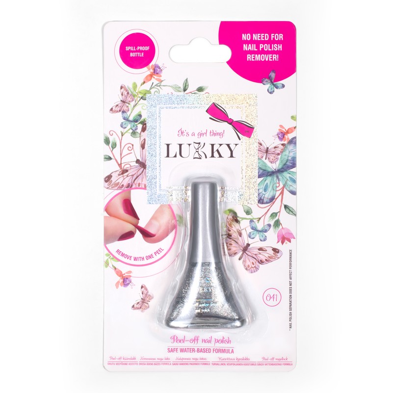 Ryškių ir sodrių spalvų nagų lakai LUKKY! Patogiausia ir geriausia tai, kad šiam lakui nuvalyti nereikia nei acetono, nei vandens, nei jokio specialaus skysčio! LUKKY nagų laką galima tiesiog nulupti! Prieš lakuojant įsitikinkite, kad nagai yra švarūs ir ant jų nėra jokių kitų kosmetikos priemonių. Nusilakuokite nagus ir palikite 2-3 min. nudžiūti. Jei norite, kad spalva būtų sodresnė, užtepkite antrą lako sluoksnį. Nuo išsipylimo apsaugantis buteliukas – tikras išsigelbėjimas tėvams, nes lakuojant nagus neliks jokios netvarkos ir dėmių! LUKKY nagų lako asortimente – įprastos, perlamutrinės ir konfeti spalvos.