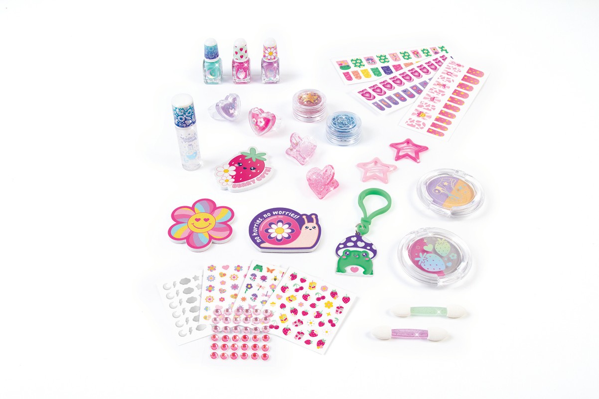 Su šiuo didžiuliu kosmetikos rinkiniu galimybės – beribės! Susikurk stilių pagal savo nuotaiką ar drabužius! Rinkinyje yra daugybė kosmetikos priemonių ir aksesuarų, suskirstytų į šešias temines kolekcijas: braškės, mieli gyvūnėliai, nostalgija, draugai, meilė ir magija! Čia rasi akių šešėlių, kūno blizgučių, lūpų blizgį, nagų laką, lipdukus, blizgučius ir daugybę kitų smagių dalykų. Du kvapnūs lūpų blizgiai kartu bus ir smagūs aksesuarai, kuriuos galėsi pasiimti su savimi. Be to, rinkinyje yra ir plaukų segtukų bei raktų pakabutis! Šis rinkinys – lengvas pirmasis žingsnis į makiažo ir grožio pasaulį. Jis bus puiki dovana gimtadienio, atostogų ar bet kuria kita proga! Visos kosmetikos priemonės yra išbandytos ir saugios vaikams nuo 8 metų.