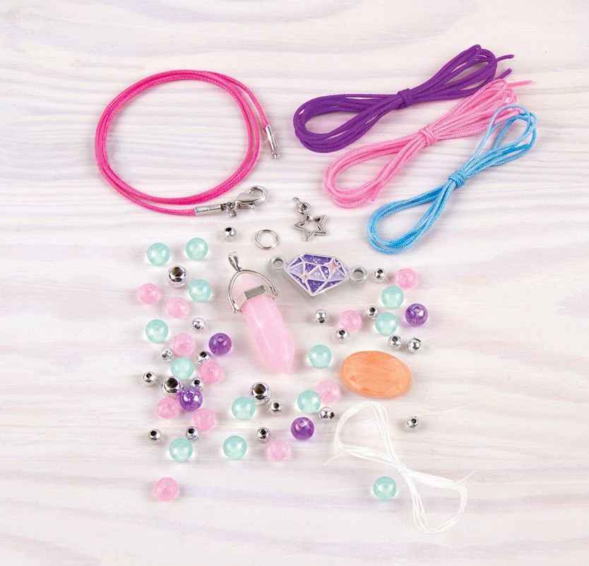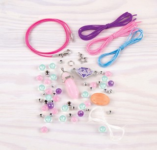 Gamink papuošalus ir susikurk išskirtinį stilių! Šiame rinkinyje rasi brangakmenių formos karoliukų ir kitų detalų, kurių pakaks kaklo papuošalui ir 3 apyrankėms pasigaminti. Viskas, ko reikia – tai šiek tiek vaizduotės ir kūrybiškumo!