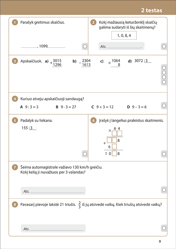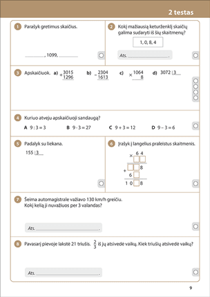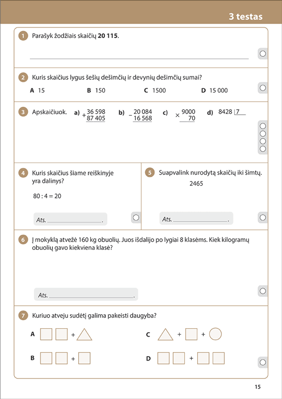Knygelėje rasite 7 testus, kuriuose patikrinami Bendrosiose programose aprašyti gebėjimai. Užduotys aprėpia įvairias matematikos sritis: skaičiavimus, geometriją, matavimus, duomenų skaitymą iš diagramų, tekstinius uždavinius ir kt. Užduotys pateiktos nuo paprastų iki sudėtingesnių, todėl mokiniai gali lavinti tiek bazinius, tiek aukštesnius mąstymo gebėjimus. Kai kurios užduotys su pasirenkamaisiais atsakymais padeda įgyti testavimo patirties, o prie daugelio pratimų palikta vietos sprendimams užrašyti.