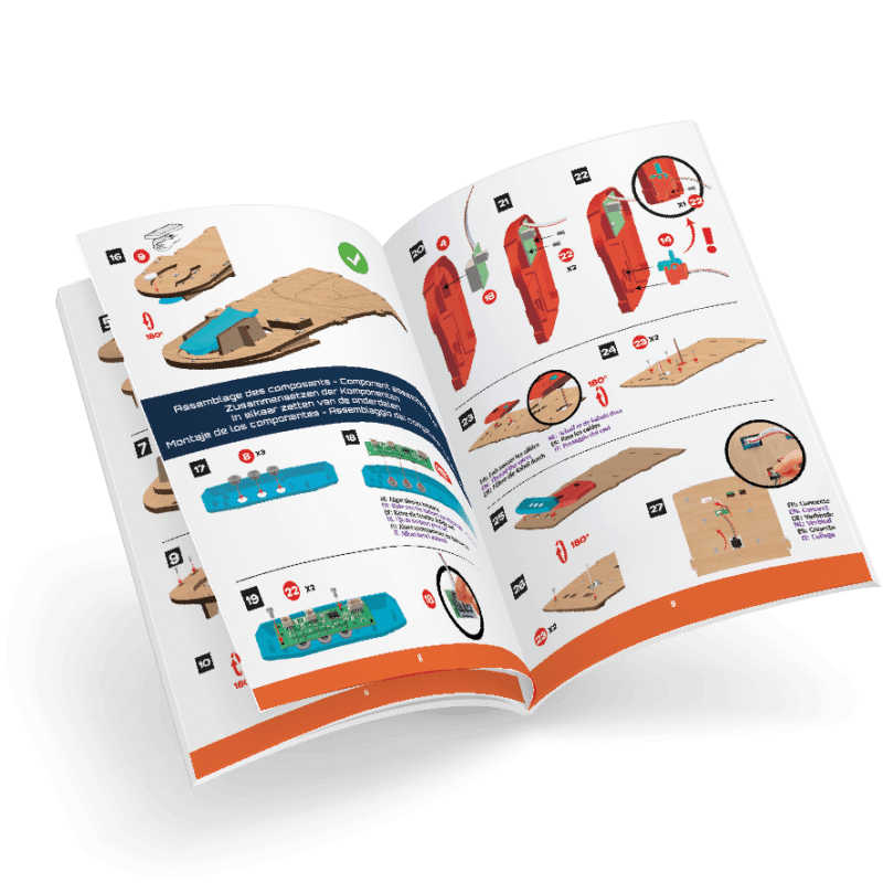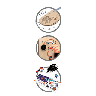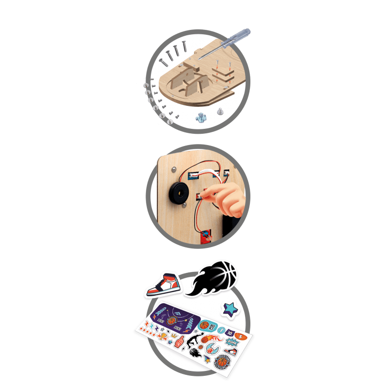 Naudodami pridedamą atsuktuvą, vaikai gali saugiai surinkti rezultatų suvestinę, valdymo skydelį, garsiakalbį ir baterijų skyrių – nereikia litavimo.