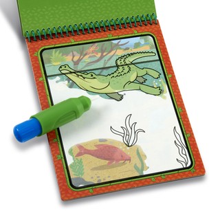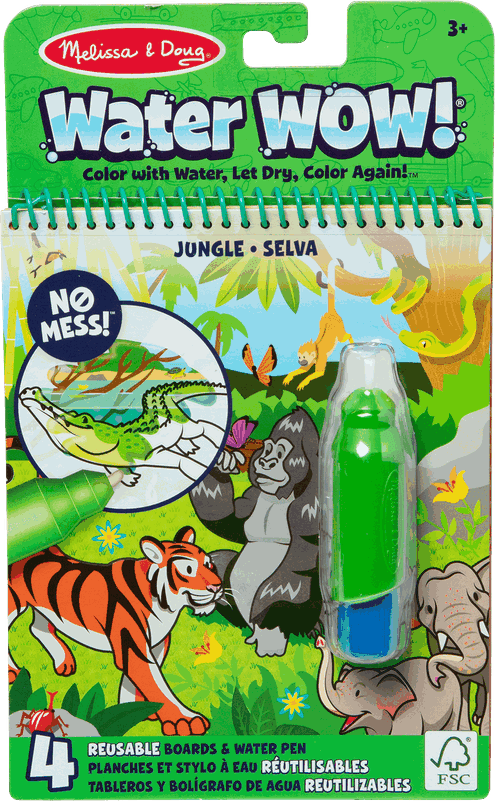 Knygelė su keturiais džiunglių tematikos spalvinimo puslapiais ir daugkartinio pildymo vandens rašikliu. Puslapiai yra daugkartinio naudojimo: sausi jie yra balti su paprastais kontūriniais piešiniais, bet sudrėkinti vandeniu atskleidžia ryškias spalvas. Patogus, didelis vandens rašiklis yra lengvai užpildomas, patogiai telpa rankoje ir yra kompaktiškame, spyruokliniame knygelės dėkle – puikiai tinka kelionėms. Lavina smulkiąją motoriką, ankstyvuosius rašymo ir skaitymo įgūdžius bei regimąjį suvokimą.