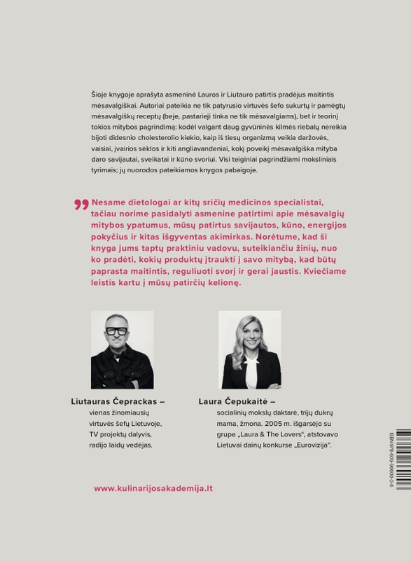 „Mėsavalgiai“ – tai pirmoji Lietuvoje knyga apie mėsavalgių arba karnivoro mitybą. Šioje knygoje aprašyta asmeninė Lauros ir Liutauro patirtis, pradėjus maitintis mėsavalgiškai. Autoriai pateikia ne tik patyrusio virtuvės šefo sukurtus, pamėgtus mėsavalgiškus receptus – beje, pastarieji tinka ne tik mėsavalgiams, – bet ir teorinį tokios mitybos pagrindimą: kodėl valgant daug gyvūninės kilmės riebalų nereikia bijoti padidėjusio cholesterolio kiekio, kaip iš tiesų organizmą veikia daržovės, vaisiai, įvairios sėklos ir kiti angliavandeniai bei kokį poveikį mėsavalgiška mityba daro savijautai, sveikatai ir kūno svoriui. Visi teiginiai pagrindžiami moksliniais tyrimais, jų nuorodos pateikiamos knygos pabaigoje.