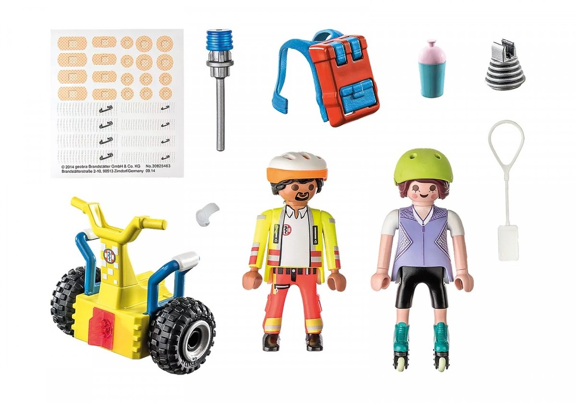 Žaislų komplektą sudaro dvi PLAYMOBIL figūrėlės, balansinis riedutis, kuprinė, riedučiai, laikrodis ir kiti priedai, skirti vaizduotei skirtam vaidmenų žaidimui. Su įvairiomis tvarsčių etikėmis sužeista figūrėlė gali būti gydoma pagal norą. Moteriškos figūrėlės riedučiai yra nuimami.
