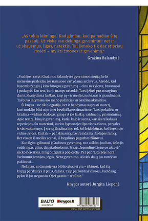Pradėjusi rašyti Gražinos Balandytės gyvenimo istoriją, kelis mėnesius praleidau jos namuose vartydama archyvus. Atrodė, kad basomis žengiu į kito žmogaus gyvenimą – einu nekviesta, braunuosi į paslaptis. Esu ten, kur ji manęs nelaukė. Tarsi įėjusi pro atsargines duris. Skaitydama laiškus, tarp jų – ir meilės, ir juokiausi, ir graudinausi. Tai buvo intymiausios mano pažinties su Gražina akimirkos.