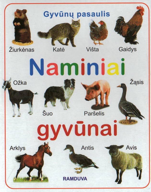 Pažintinė vaikiška knygelė apie naminius gyvūnus su iliustruotais tikroviškais paveikslėliais.