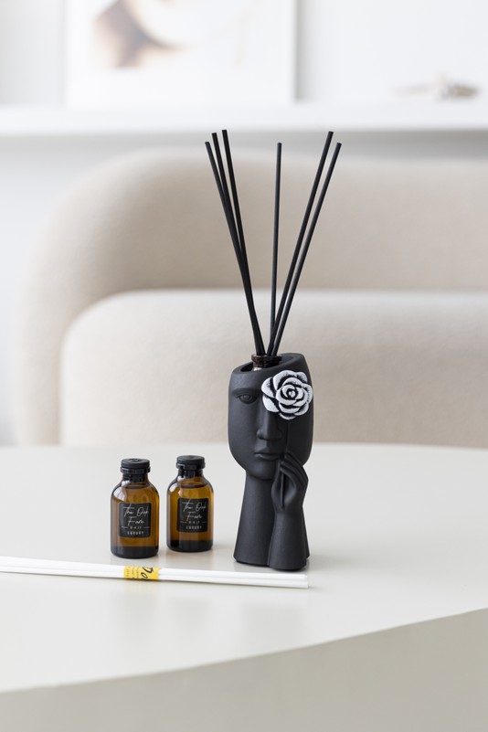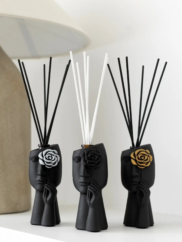 Išskirtinis rankų darbo namų kvapas – mažos statulėlės formos, įkvėptas skandinaviško stiliaus, pagamintas iš keramikinio gipso. Gintaro spalvos 20 ml buteliukas su kvapiuoju skysčiu įstatomas į statulėlės vidų.