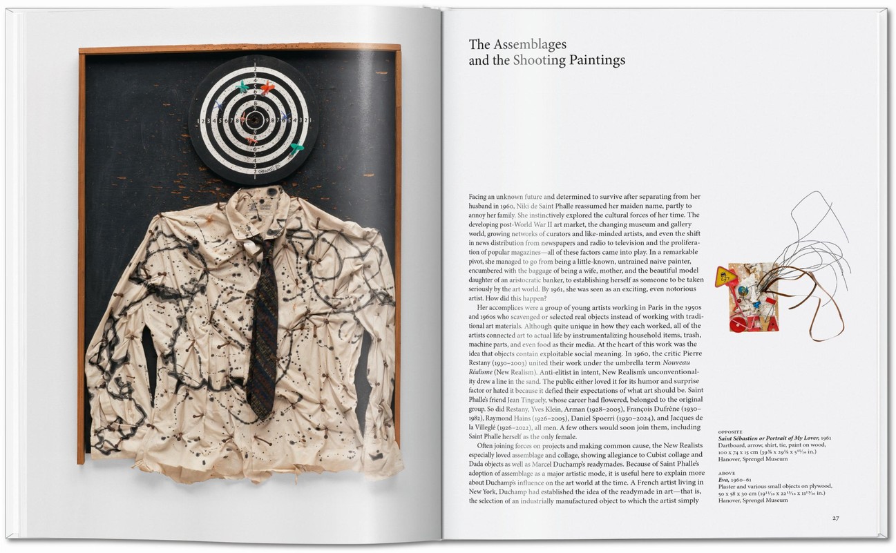 A key contributor to Nouveau Réalisme in early 1960s Paris, Niki de Saint Phalle (1930-2002) worked alongside artists such as Arman, Yves Klein, and Jean Tinguely, scavenging real objects in place of traditional art materials. She connected art to life by instrumentalizing household items, machine parts, and even toys for her early assemblages. Saint Phalle created her first shooting painting, or Tir, in 1961, and went on to conduct these performances in such varied locations as the Impasse Ronsin in Paris, a garden in Amsterdam, a sandpit outside Stockholm, and the Malibu Hills. Reliefs made of plaster, small objects, paint, wood, and wire were punctured by the bullets of a gun.