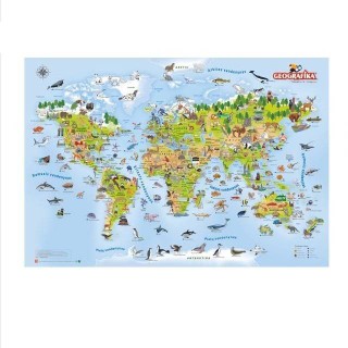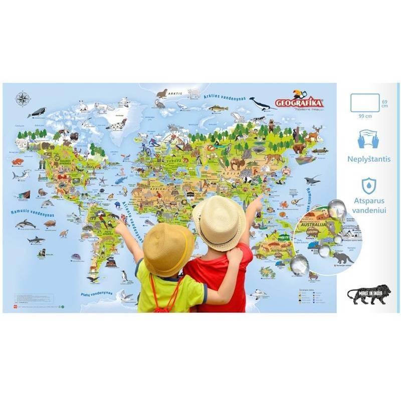 „Geografika“ žemėlapiai apjungia paprastą kartografiją su tyrinėjimą skatinančiais paveiksliukais, kad vaikai jau nuo 6 metų galėtų daugiau sužinoti apie šalis, žemynus, vandenynus, upes, miestus, sportą, patiekalus, gyvūnus, paukščius ir dar daugiau.