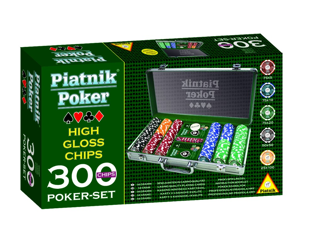 Šis pokerio rinkinys – šauni dovana azartiškam žmogui, taip pat puiki išeitis mėgstantiems pokerį žaisti bet kur ir bet kada. Pokerio lagaminėlį patogu nešiotis su savimi arba laikyti mašinoje. Žetonų skaičius – pakankamas, kad būtų užtikrintas geras ir azartiškas visą vakarą trunkantis žaidimas. Dvi pokerio kortų kaladės su skirtingų spalvų nugarėlėmis. Kortos – kokybiškos ir tvirtos, jos neslysta, tad malonu laikyti rankose, ir, kas svarbiausia, nesusilamdo ir nesusigadina net sužaidus pačią emocingiausią partiją. Kortos standartinio dydžio, jose esantys skaičiai ir paveikslėliai gerai įžiūrimi net esant silpnam apšvietimui, tad žaidėjai nesigadina akių. Rinkinyje yra: 300 įvairios vertės žetonų. Žetonai pagaminti iš specialaus aukštos kokybės plastiko, neslysta rankose, kiekvienas jų sveria 14 gramų, jie yra tokie patys, kokiais žaidžiama tikrame kazino. Dalintojo žetonas 5 žaidimo kauliukai Patogus lagaminas. Į lagaminą puikiai telpa visi pokerio reikmenys, čia juos galima tvarkingai laikyti ir patogiai nešiotis. Vidinė lagamino pusė padengta minkšta medžiaga, kuri saugo žetonus nuo įbrėžimų bei užtikrina, kad nešant lagaminą visos žaidimo dalys liktų savose vietose, yra specialūs grioveliai kortoms.