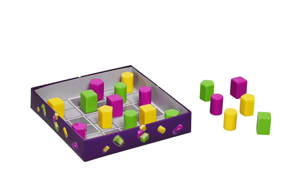 Žaidimas žaidžiamas ant dėžutėje esančios žaidimo lentos. Žaidimo lentą sudaro devyni 2x2 sektoriai – 4 tamsiai pilki ir 5 šviesiai pilki . Žaidimo dėžutę padėkite ant stalo per vidurį. Ant apatinių kiekvieno sektoriaus laukelių pastatykite po vieną figūrėlę. Žaidėjų tikslas – pirmiesiems pastatyti 3 vienodos spalvos arba vienodos formos figūrėles į vieną iš 2x2 sektorių.