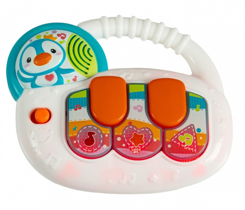 - Fortepijonas turi įjungimo/išjungimo jungiklį; įjungus, jis groja linksmus melodijas ir šviečia.
