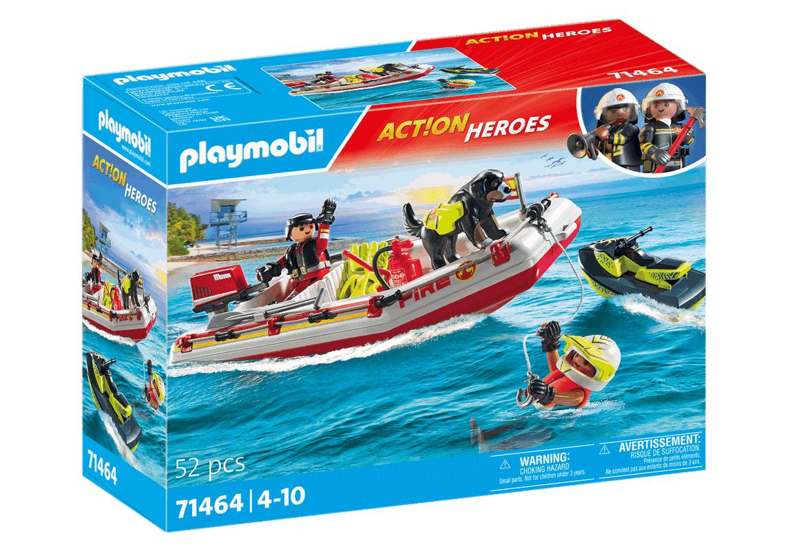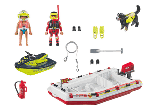 Vykdyk įspūdingas gelbėjimo misijas su naujuoju PLAYMOBIL ugniagesių laivu! Nardymo įranga aprūpintas ugniagesys gelbsti nelaimės ištiktą vandens motociklininką, o jam padeda specialiai apmokytas vandens gelbėtojų šuo. Laive yra dvi sėdynės su pėdų spaustukais, irklai ir pasukamas užbortinis variklis. Pasodinus figūrėlę ant vandens motociklo, jis plūduriuoja ant vandens. Šuo judina galvą ir uodegą, turi nuimamą gelbėjimo liemenę. Tai fantastiškas žaidimų rinkinys, skirtas įdomiems vaidmenų žaidimams ir herojiškiems nuotykiams. PLAYMOBIL ugniagesių laivas yra puiki dovana veiksmą mėgstantiems vaikams nuo 4 metų.