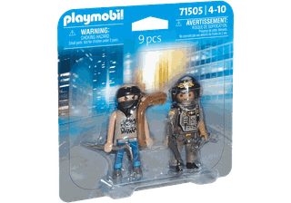 PLAYMOBIL rinkiniai su dviem figūrėlėmis bei įvairiais priedais – tai dvigubai daugiau džiaugsmo ir smagių vaidmenų žaidimų! Šiame rinkinyje yra pareigūnas su šalmu ir antrankiais ir nusikaltėlis su veido kauke. PLAYMOBIL dviejų figūrėlių rinkiniai – puikus siurprizas ir šauni dovana kūrybingiems vaikams nuo 4 metų.