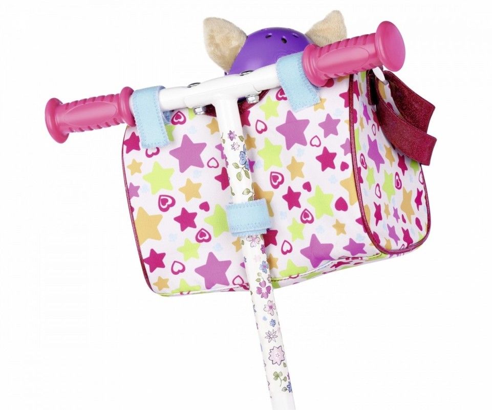 Transportavimo krepšys - spalvingas krepšys su nuostabiu žvaigždžių dizainu turi tris lipdukus gale, kuriuos lengva pritvirtinti prie dviračio ar paspirtuko vairo. Taigi vaikai visada gali pasiimti savo šuniuką į keliones.