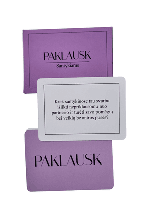 „Paklausk | Santykiams“ – tai gilių klausimų rinkinys poroms, norinčioms augti, stiprėti ir dar geriau pažinti vienas kitą, nes tikri ryšiai gimsta ten, kur atsiranda drąsa būti atviriems.