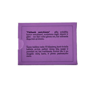 Šiame žaidime rasite 50 klausimų, kurie kviečia kalbėtis atvirai, pažinti vienas kitą naujai ir pastebėti tai, kas svarbiausia. Kortos tiks tiek po daugelio metų kartu, tiek ir santykių pradžioje.