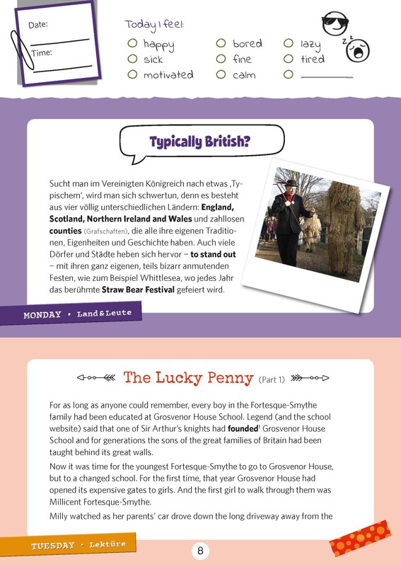 Interessantes über Land und Leute, unterhaltsame Lesetexte, Grammatik und Wortschatz, Witze und zum Abschluss fürs Wochenende etwas Kulinarisches: Nimm dir täglich deine kleine Auszeit und erweitere so effektiv deine Sprachkenntnisse. Mit täglichem Kreativteil zum Ausfüllen.