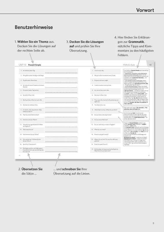 wird in überschaubaren Portionen erklärt, z. B. die Verben to be und to have, present tense, Possessivpronomen, gerund, Konjunktionen und vieles mehr