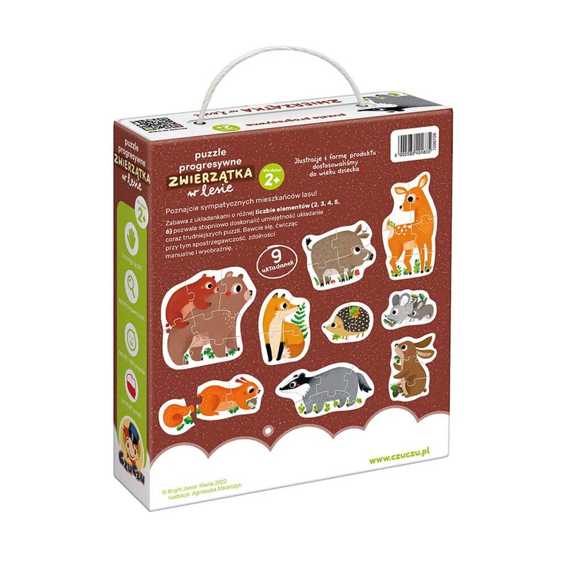Patikima dėžutė talpina daugybę miško gyvūnų: nuo mažų pelėnų iki lokių. 9 galvosūkiai turi skirtingą elementų skaičių: 2, 3, 4, 5 ir 6. Skirtingos fono spalvos ant atvirkščiųjų pusių padės juos atskirti. Vaikai gali palaipsniui tobulinti įgūdžius, sudėdami vis sudėtingesnius galvosūkius. Gražios iliustracijos, dideli elementai ir produkto forma daro rinkinį idealiu kaip pirmuosius sudėtingesnius galvosūkius vaikams.
