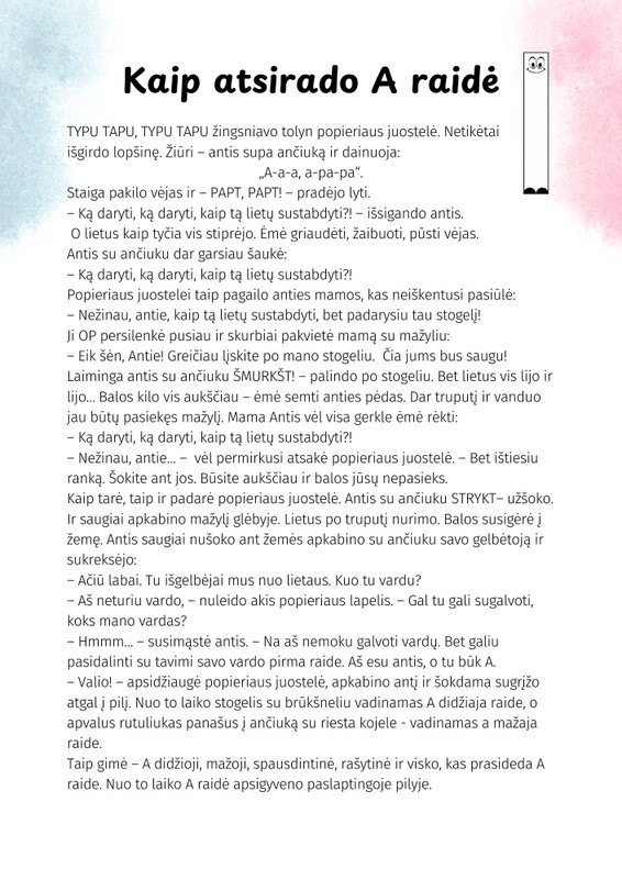 Ši knyga skirta visiems mažiesiems, kurie pradeda savo kelionę į raidžių pasaulį, pedagogams ir šeimoms, kurios nori lengvai ir žaismingai vesti vaiką žinių taku, o ir patys pagaliau sužinoti – na kodėl gi tos mūsų lietuviškos raidės būtent tokios, o ne kitokios.