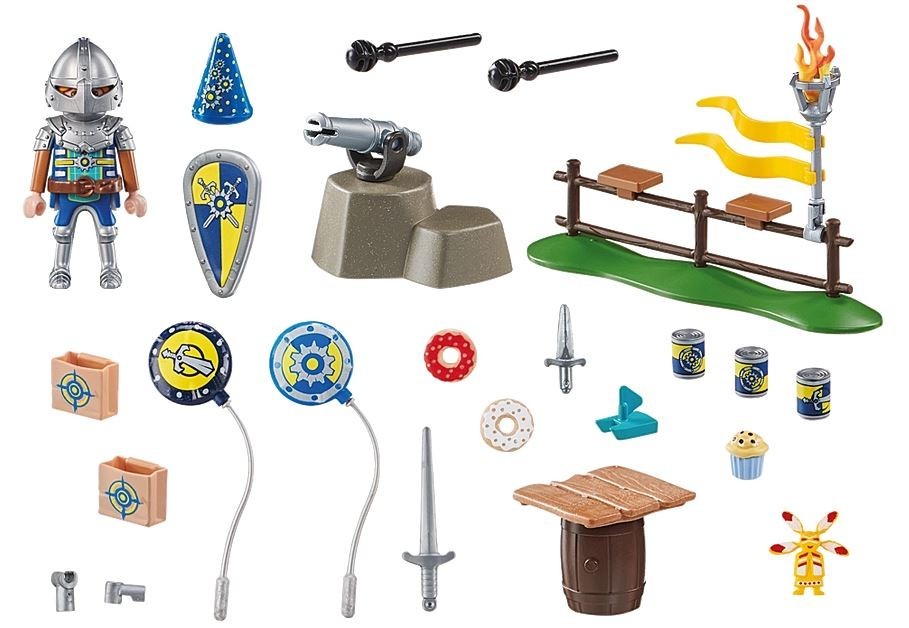 Arwynn švenčia riterišką gimtadienį su skardinių šaudymu, saldumynais ir daugybe aksesuarų. Leiskitės į jaudinančią kelionę į riterių pasaulį su PLAYMOBIL Riterio gimtadienio dovanų rinkiniu! Čia drąsus riteris "Princas Arwynn" švenčiamas stilingai. Užuot gavę dovanas tiesiogiai, turėsite laimėti jas per jaudinančius mūšius ir pasimėgauti skaniais donutais bei keksiukais. Taikykitės su patranka, kad pataikytumėte į dovanų maišelius ir laimėtumėte nuostabius prizus. Rinkite taškus įdomiame skard…