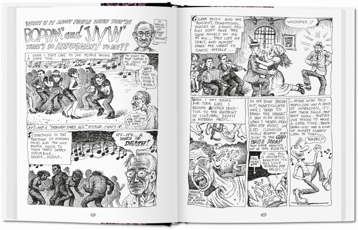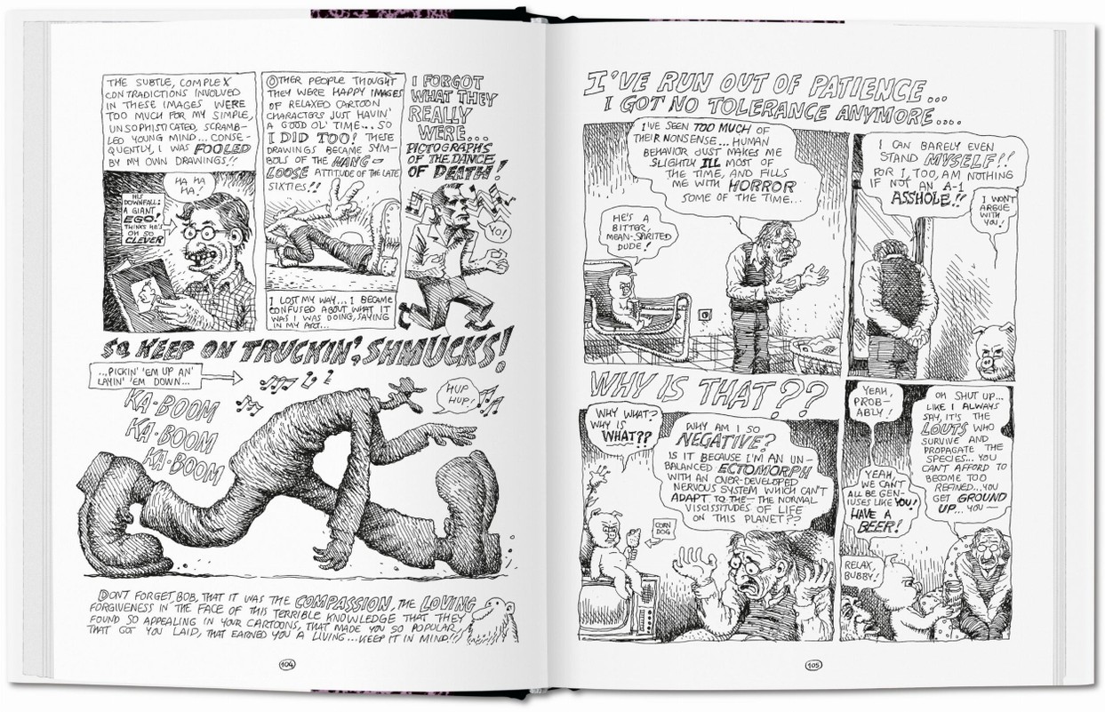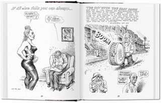As this volume opens we find our hero at age 46, solidly into the midlife crises years. Crumb has lived his entire life in anxious, introspective, self-flagellating crises, however, so the middle years bring only a refinement of his lifelong turmoil and further honing of artistic talent. More words accompany the drawings, demonstrating Crumb’s brilliant powers of observation, as in a long paragraph devoted to an encounter with one of brother Maxon’s vegan turds, and a poetic paean to the heartbreak of life and aging. The family’s move to Sauve, France, in 1991 is heralded by a switch from portraits of apple-cheeked American girls sketched while waiting for food in California cafes to portraits of girls in French cafes, by pastorals of rampant French countryside, and by haunting tableau of homeless beggars in the Metro.