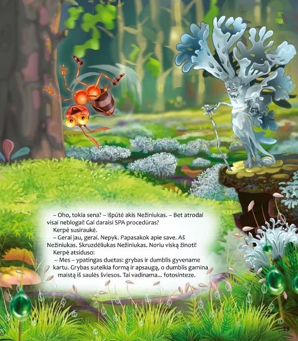 Kartu su juo susipažinsi su vėdarėliais – mažaisiais vėžiagyviais, sužinosi, kuo ypatingos yra samanos ir kerpės, kaip auga grybai ir kodėl jie tokie svarbūs miškui. Nežiniukas sutiks išmintingą pelėdą, draugišką žaltį ir sužinos, kuo pastarasis skiriasi nuo angies. O svarbiausia – skruzdėliukas supras, kas yra maisto grandinė, ir suvoks, kad visi gamtos gyventojai yra svarbūs – nuo mažiausio vabaliuko iki didžiausio paukščio.