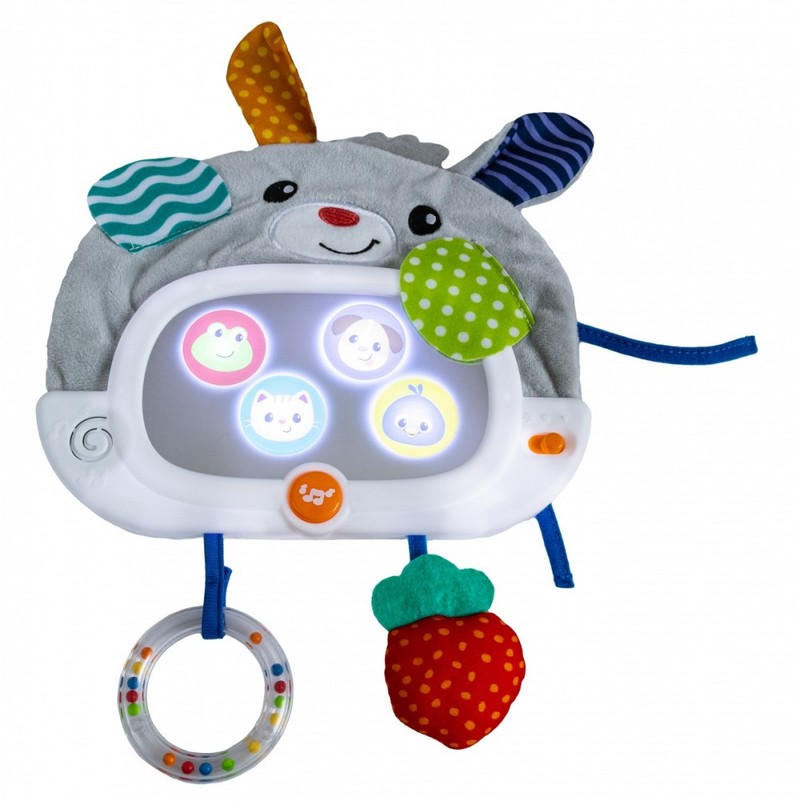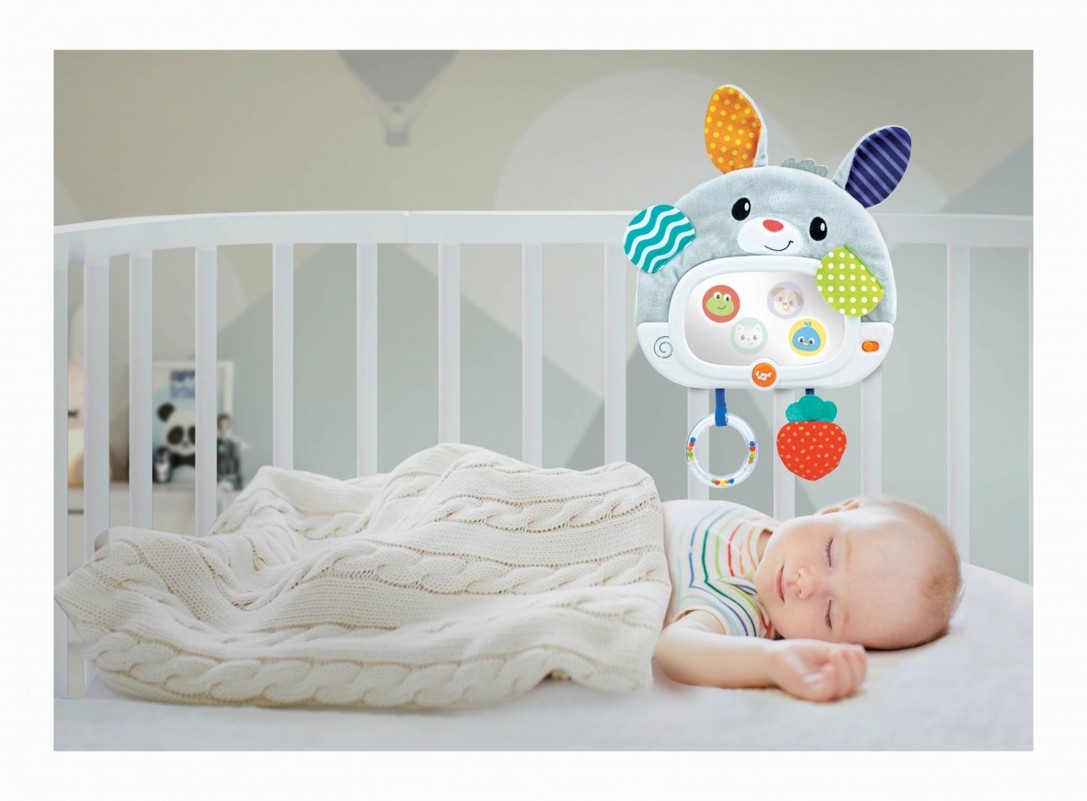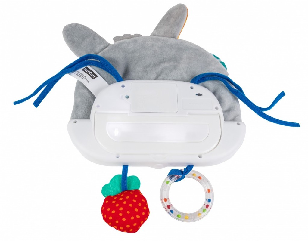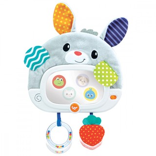 Švelnus triušis, kurį galima pritvirtinti prie lovelės sruogų, su saugiu veidrodžiu ant pilvuko. Veidrodyje yra šviesos efektų, keturios paslėptos nuotraukos ir melodijos, tinkamos dienos ir nakties režimui. Nakties režimui skamba švelnūs gamtos garsai ir ramios melodijos, padedančios užmigti. Pridedami traukiami barškučiai apskritimo ir vaisiaus forma, taip pat šnarantys ausys yra dar vienas mūsų triušio privalumas. Žaislas turi patogų stovą, leidžiantį žaisti ant grindų.