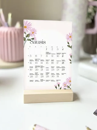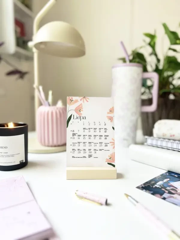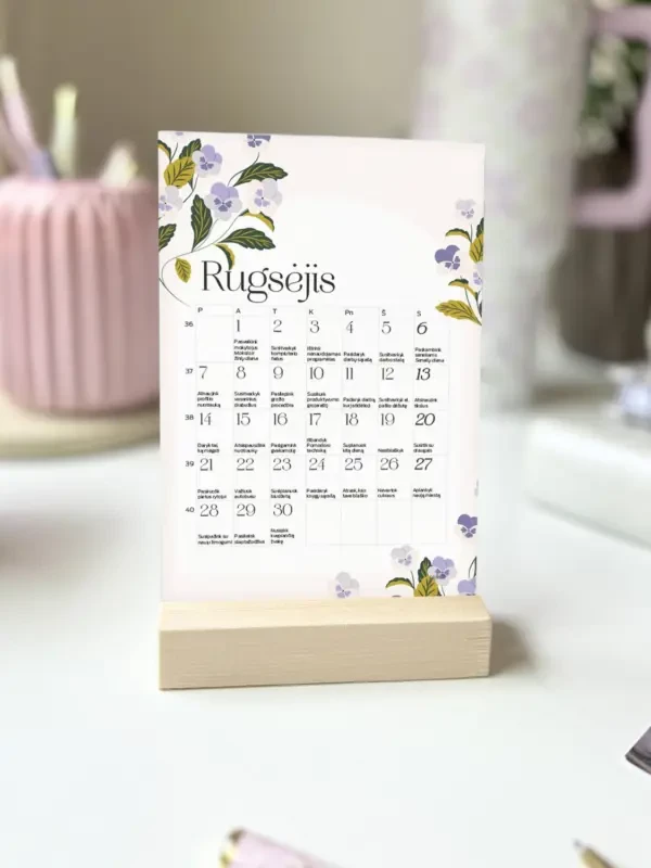 Kalendorius išsiskiria savo stilingu dizainu, dekoruotu subtiliais gėlių motyvais, kurie harmoningai įsilieja į bet kurį interjerą. Jo lengvas ir estetiškas vaizdas puikiai tinka tiek namams, tiek biurui.