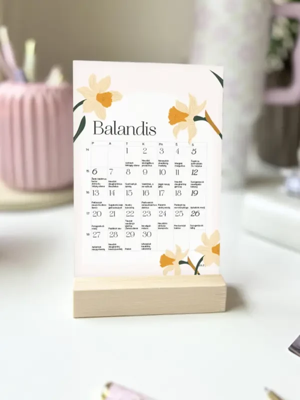 Siauras medinis stovelis – praktiškas ir ilgaamžis, užtikrinantis, kad kalendorius visada stovės stabiliai ir gražiai atrodys ant jūsų stalo, lentynos ar virtuvės spintelės.