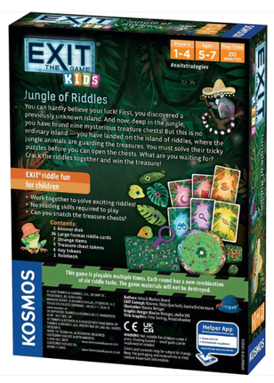 Amžius: nuo 5 m.Žaidimo trukmė: 20 min.Žaidėjų skaičius: 1–4.Nuostatų kalba: LT, LV, EE. Pabėgimo kambario tipo žaidimas, skirtas mažiesiems žaidėjams. Giliai džiunglėse, radote devynias paslaptingas lobių skrynias! Tačiau tai nėra įprasta sala – jūs atsidūrėte mįslių saloje, kur lobius saugo džiunglių gyvūnai. Prieš atidarydami skrynias, turite išspręsti jų sudėtingus galvosūkius. Žaidimo komponentai 1 atsakymų diskas, 36 didelio formato mįslių kortos, 7 keisti daiktai, 9 lobių skryni…