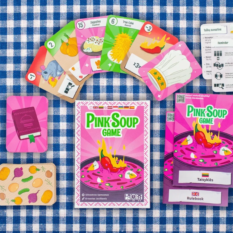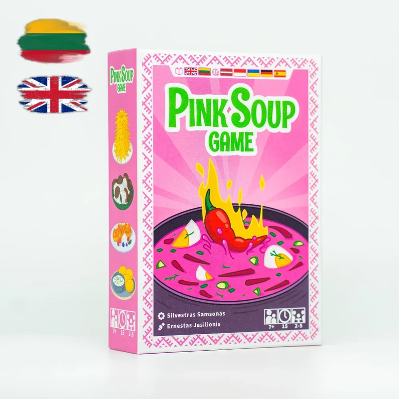 „Pink Soup Game“ – Lietuviškos virtuvės šėlsmas! Tapk virtuvės šefu ir pasinerk į kulinarinį mūšį! Rinkite ingredientus, gaminkite tradicinius lietuviškus patiekalus ir lenktyniauk su kitais šefais. Bet atsargiai – konkurentai gali įmesti į jūsų puodą degantį čili pipirą! Amžius: nuo 7 metų. Žaidimo trukmė: 15 minučių Žaidėjų skaičius: 2–5. Nuostatų kalba: LT, EN. Kūrėjas: Silvestras Samsonas. Menininkas: Ernestas Jasilionis. Kodėl verta rinktis? Dvikalbis žaidimas (lietuvių ir a…