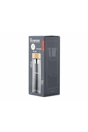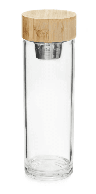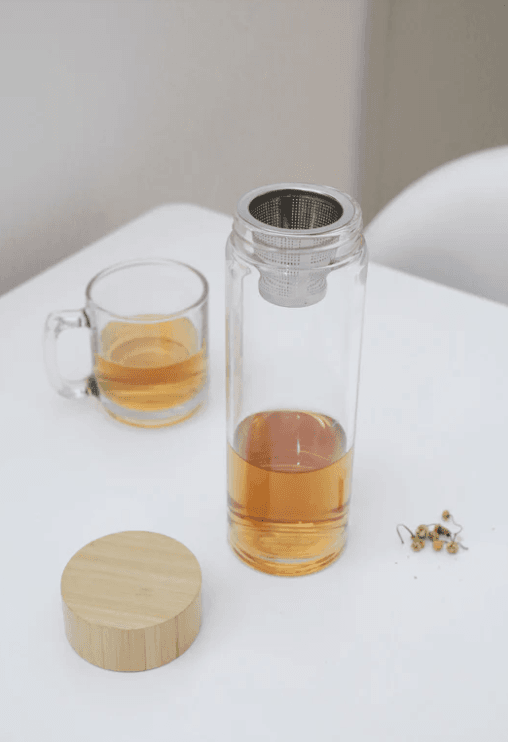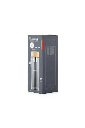 „Kikkerland“ modernus stiklinis butelis su infuzoriumi ir saugiu bambukiniu dangteliu, skirtas arbatai paruošti ir gerti.