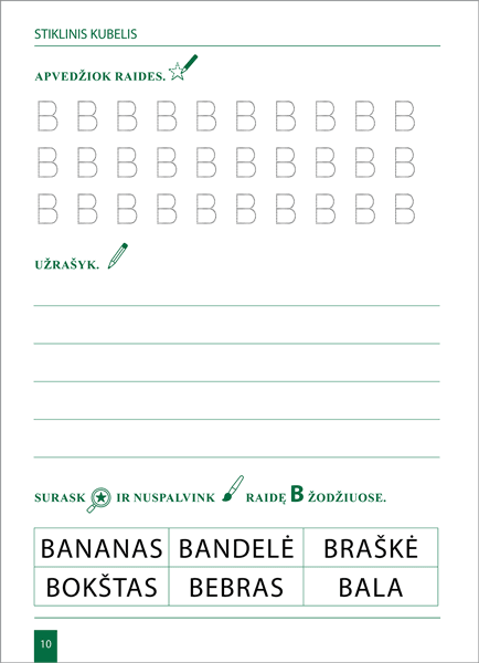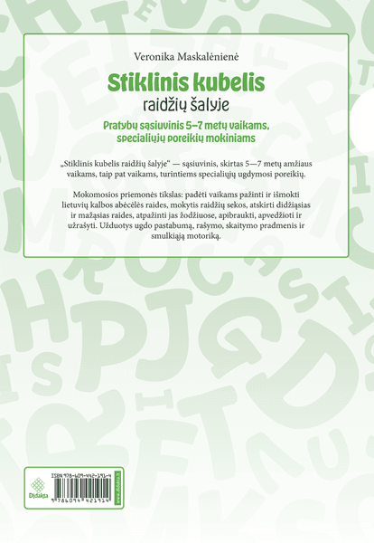 „Stiklinis kubelis raidžių šalyje“ – tai patrauklus ir vaikams pritaikytas pratybų sąsiuvinis, skirtas lietuvių kalbos raidžių pažinimui ir jų rašymo pradmenims ugdyti. Įvairios vizualiai aiškios ir žaismingos užduotys padeda vaikams įgyti svarbiausius skaitymo bei rašymo įgūdžius. Pratybų sąsiuvinis ikimokyklinio, priešmokyklinio ir pradinio ugdymo vaikams bei specialiųjų poreikių mokiniams.
