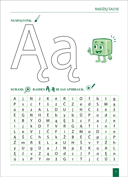 Skatinti dėmesingumą ir pastabumą – užduotys reikalauja surasti ir nuspalvinti tam tikras raides žodžiuose.