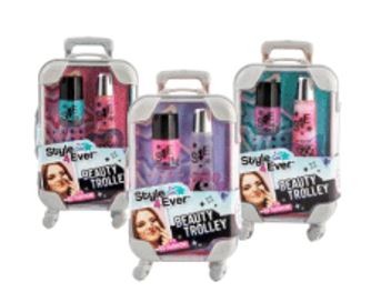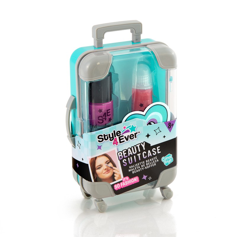 Mini lagaminėlis pilnas siurprizų! Pasiimk savo kosmetikos priemones į kiekvieną kelionę! Rinkinyje yra lūpų ir nagų priemonės bei priklijuojami blizgučiai!